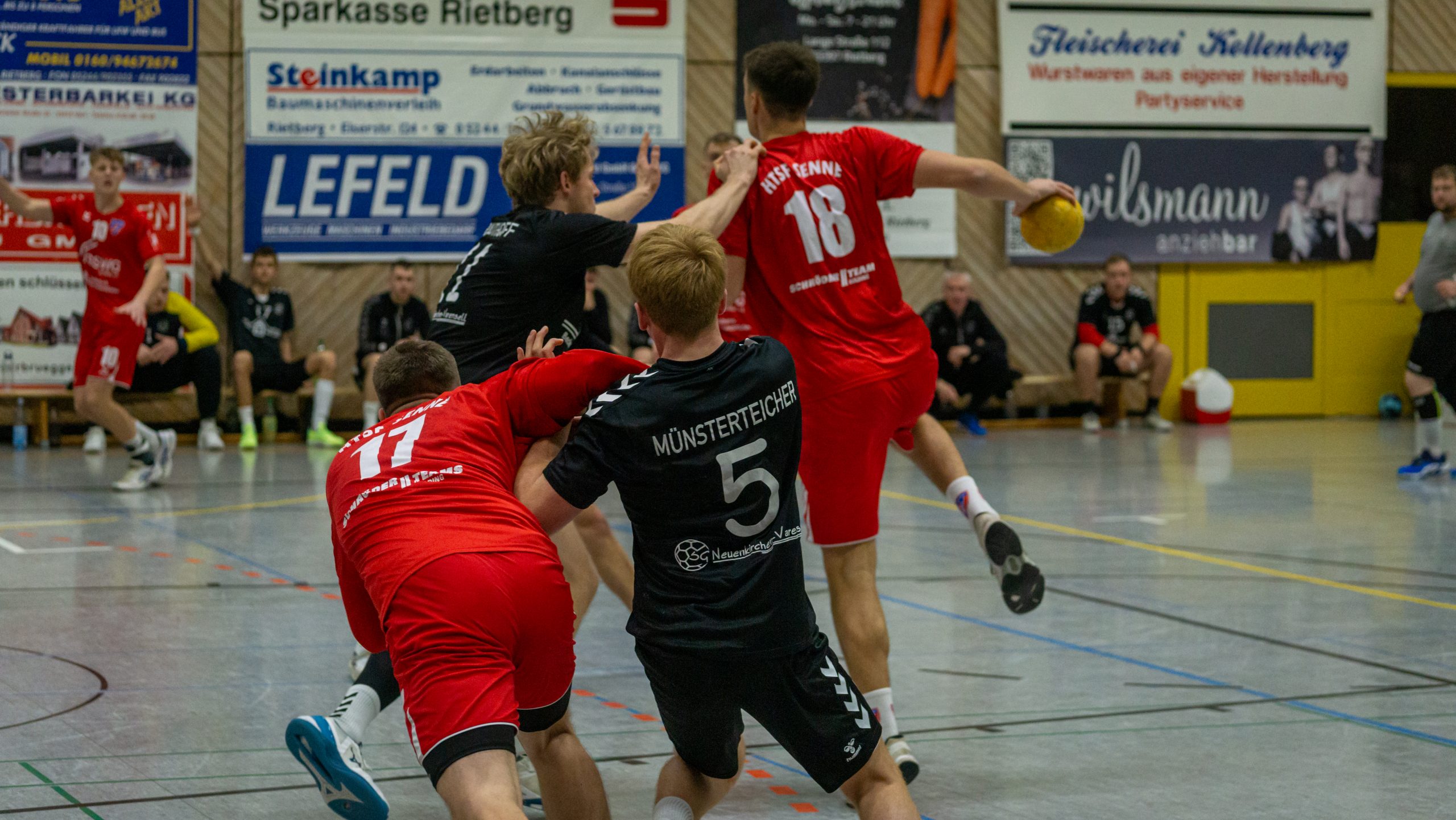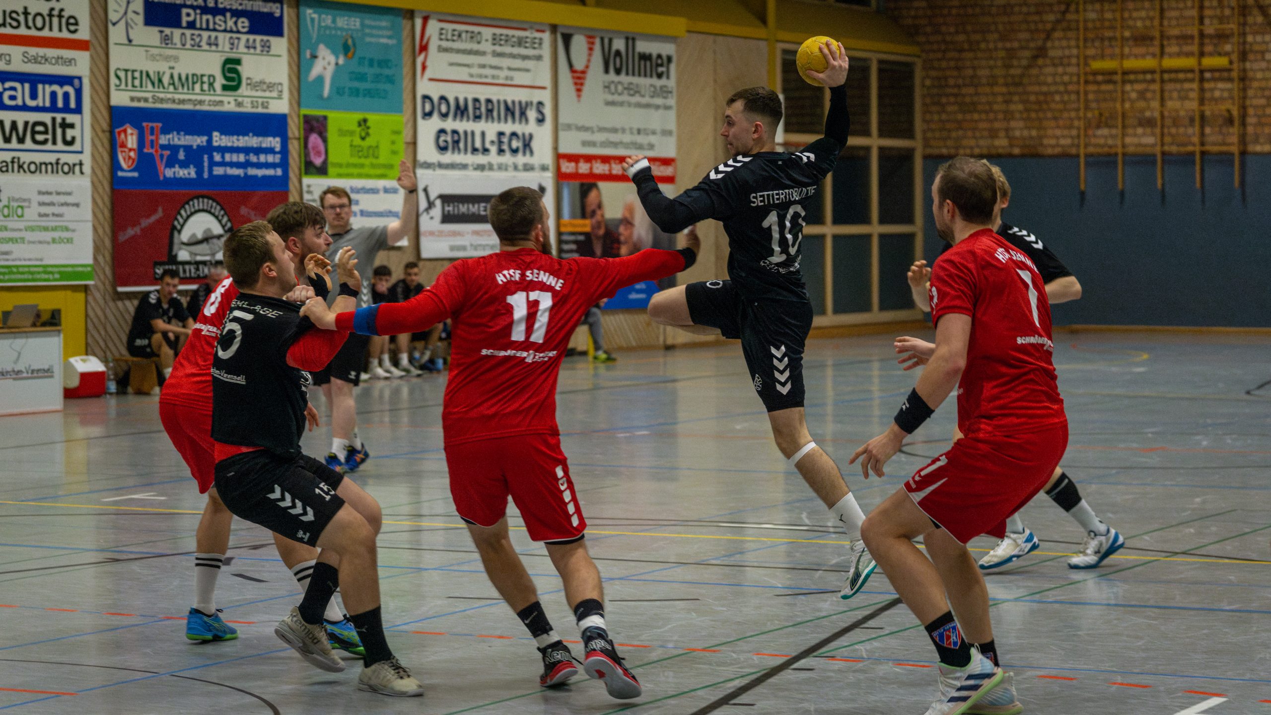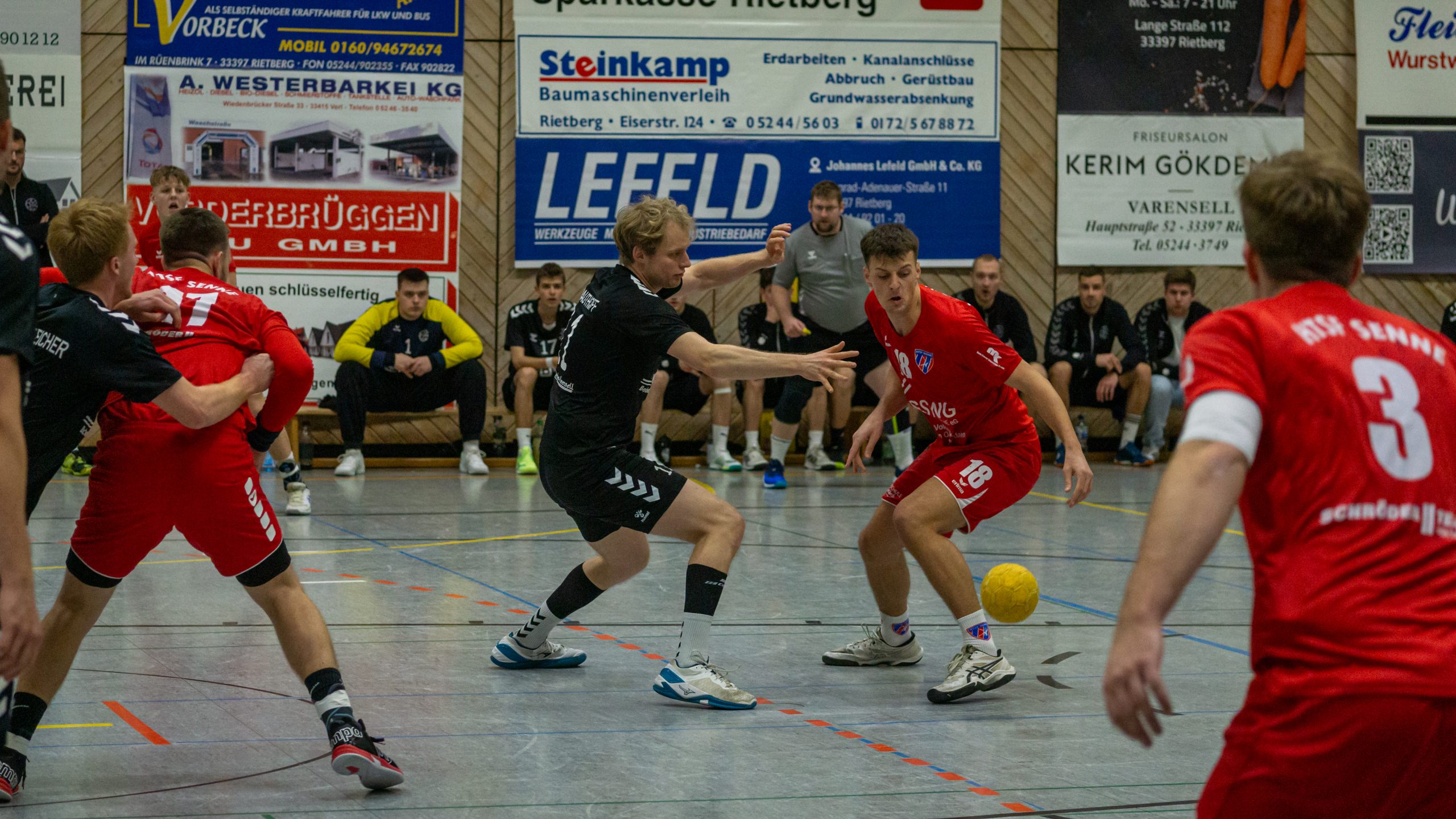 Von Beginn an zeigte sich, warum beide Teams an der Tabellenspitze stehen: Senne und Versmold punktgleich auf Platz 1 und 2, wir direkt dahinter auf Platz 3. Die ersten 13 Minuten waren geprägt von einem ständigen Hin und Her, bei dem keine Mannschaft sich absetzen konnte. Doch ab der 14. Minute bekamen wir unsere Abwehr besser in den Griff und konnten uns mit einem kleinen Vorsprung von drei Toren absetzen. So ging es mit einer knappen Führung von 16:14 in die Halbzeitpause.