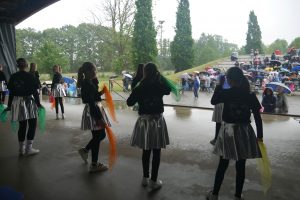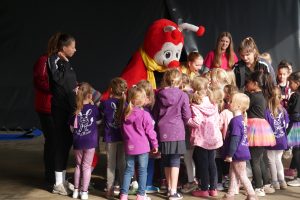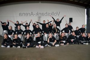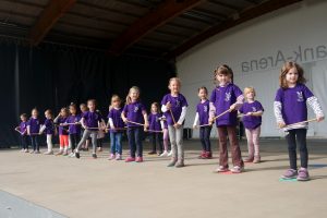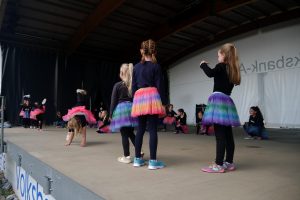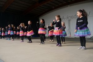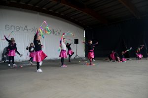 Als dann zum Glück der Himmel etwas aufklarte, konnten am Nachmittag die vereinseigenen Tanzgruppen Flohhüpfer, Springmäuse, Discobienchen, Glitzergirls und Hip Hop vor zahlreichem Publikum ihr Können präsentieren. Die Mädchen im Alter von 4 bis 16 Jahren performten in ihren bunten, glitzernden und strahlenden Outfits sowohl Einzeltänze als auch ein großes gemeinsames Finale mit über 90 Tänzerinnen und Tänzern zum Lied „Shut up and dance!“ Als Überraschung kam dann auch der Rieti selbst noch mit auf die Bühne und sorgte für große strahlende Kinderaugen. Auch der zwischenzeitige Sturzregen konnte das Publikum nicht vertreiben. Diverse Regenponchos wurden auf der Bühne an die zahlreichen Zuschauer verteilt und das bunte Programm konnte fortgeführt werden. Moderatorin Marina Bäumker bedankte sich im Namen des Vereins mit Co- Moderatorin Lenia Beck bei allen Aktiven und für die Treue bei Wind und Wetter die Akteure anzufeuern!. Für so einen grandiosen Auftritt bekamen nicht nur die Übungsleiterinnen und Helferinnen ein Dankeschön vom Verein, sondern auch die kleinen besonderen Akteure durften sich über eine Tafel Schokolade freuen.