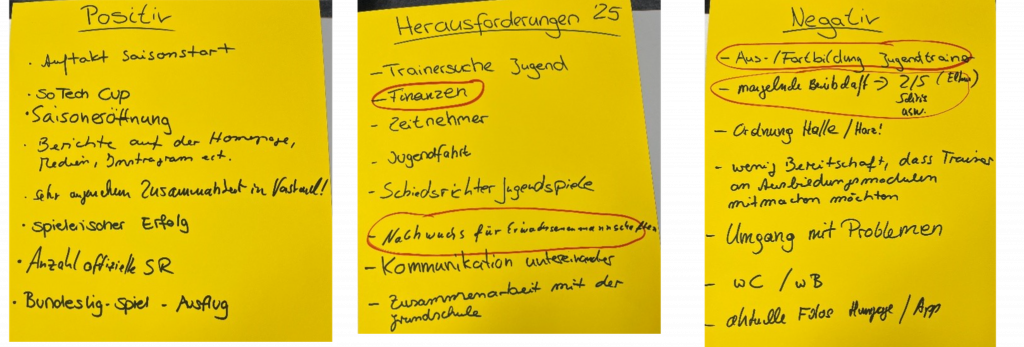 Bevor wir Themen für den Nachmittag festgelegt haben, haben wir uns noch kurz die „to-do’s“ aus 2023 angeschaut, um zu sehen, was hier vielleicht auch wieder aufgegriffen werden kann. Wir hatten damals festgelegt, dass es uns wichtig ist, das Vereinsleben wieder aufleben zu lassen und ein größeres „Wir-Gefühl“ auch unter den Mannschaften bekommen möchten. Aber auch um die Ausbildung unserer Jugendspieler wollten wir uns kümmern. Dieser Punkt kam im letzten Jahr sicherlich noch etwas zu kurz, sodass sich 2 Gruppen dem Nachwuchs des Vereins widmeten. Einmal ging es um die Jugendarbeit allgemein und eine andere Gruppe hat sich um die Spielerausbildung Gedanken gemacht. Eine 3. Gruppe kümmerte sich um die Finanzen der Abteilung. Hier wurden Schwachstellen aufgedeckt und Ideen für höhere Einnahmen gesammelt.